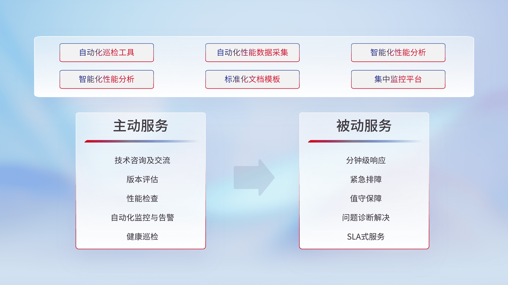 智能化工具和标准化文档,,保障服务质量,,提供主动服务(包含技术咨询、、、、版本评估、、性能检查、、、、自动化监控与告警、、、、健康巡检)和被动服务包含(分钟级响应、、、紧急排障、、值守保障、、、问题诊断解决、、、、SLA服务)。。