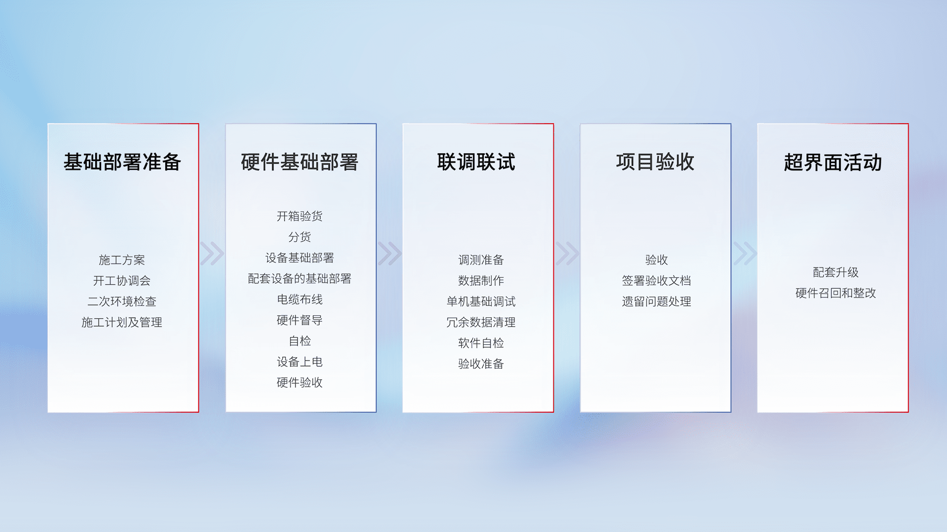 从基础部署准备、、、、硬件基础部署、、、、联调联试、、、项目验收、、、、越界面活动的全过程可追溯,,,保证施工质量和进度。。。。